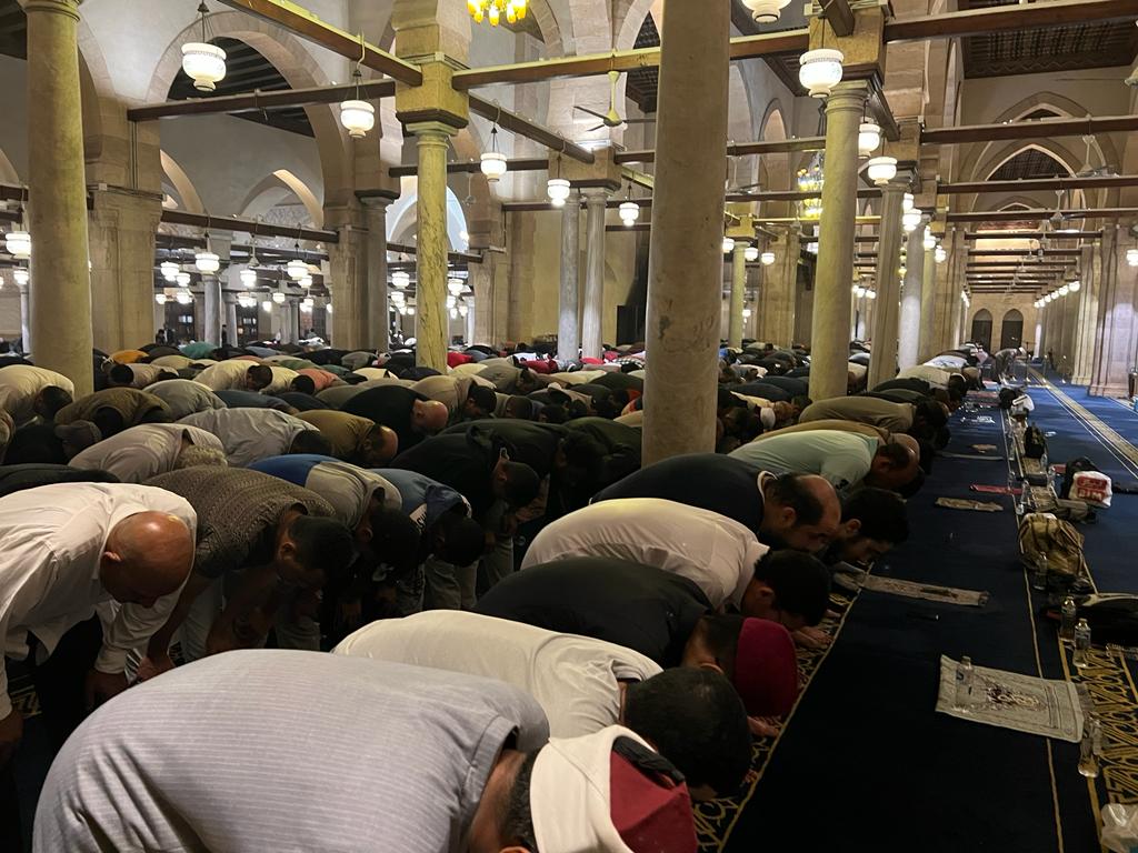 جموع المصين بالجامع الأزهر يؤدون صلاة العشاء والتراويح ويستمتعون بالأجواء الرمضانية