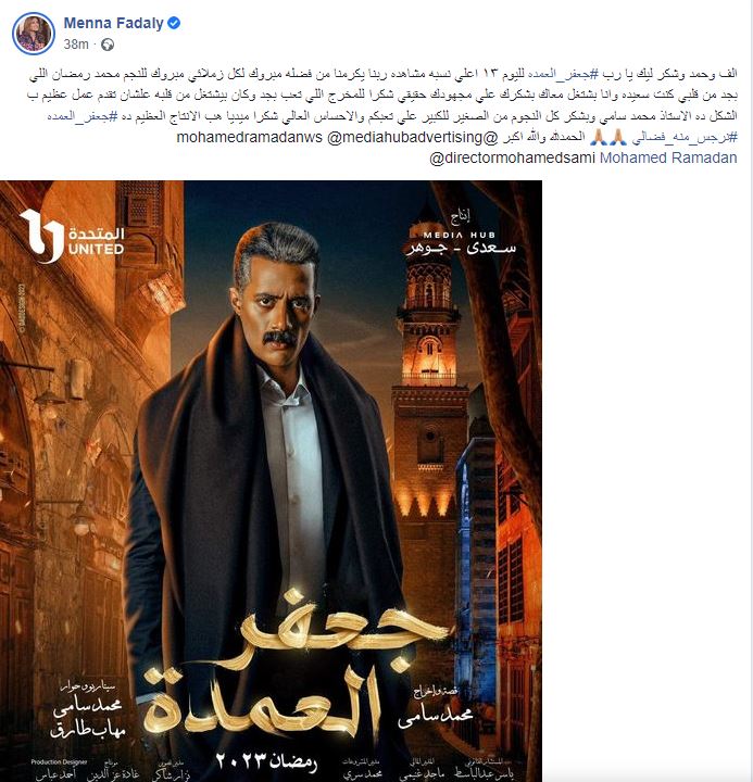 وكتبت منه فضالي، قائلة :"الف وحمد وشكر ليك يا رب جعفر العمدة لليوم ١٣ اعلي نسبه مشاهده ربنا يكرمنا من فضله مبروك لكل زملائي مبروك للنجم محمد رمضان اللي بجد من قلبي كنت سعيده وانا بشتغل معاك بشكرك علي مجهودك حقيقي".