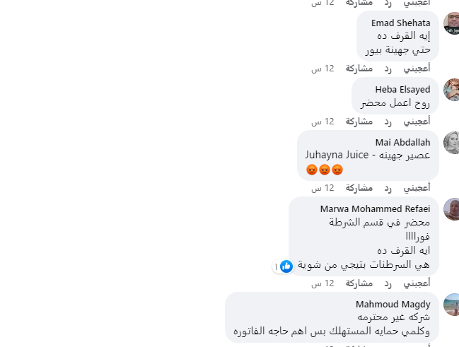 وقالت صاحبة المشكلة عن عصير جهينة،" مساء الخير ياريت تاخدو بالكو من عصائر جهينه اخر مرة هدخلها بيتى بعد القرف اللي شفته دة وياريت حد يقولي اتصرف ازاى لانى بصراحه مش ناويه اسكت علي الاستهتار وقله الضمير دى حسبي الله ونعم الوكيل وياريته رخيص كان الواحد قال ما هو انا استرخصت لكن للاسف المفروض انه من اغلي الانواع"، وطالبها عدد كبير من المتابعين بتحرير محضر والتقدم بشكوي فى جهاز حماية المستهلك