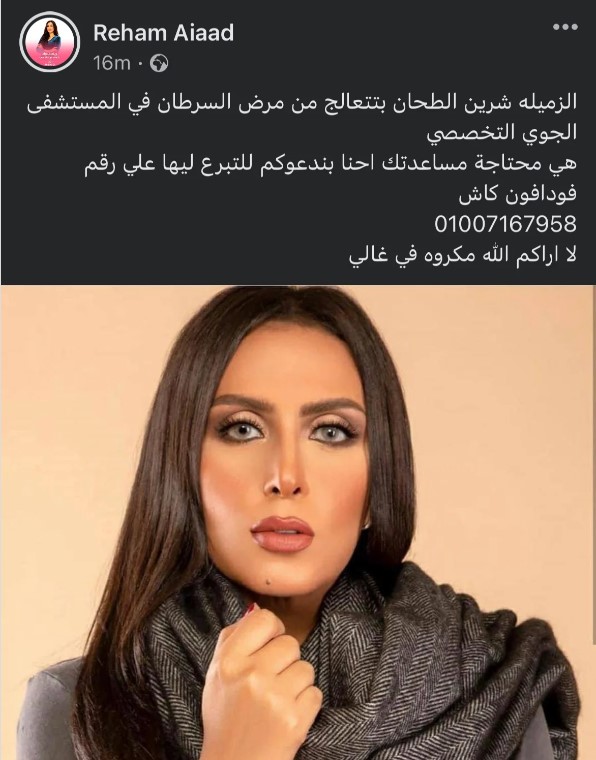 وكتبت ريهام عياد عبر حسابها على موقع التواصل الإجتماعي "فيسبوك" أنها الفنانة شيرين الطحان تخضع للعلاج في الوقت الحالي بالمستشفى الجوي التخصصي، مشيرة إلى أنها تحتاج في أشد الحاجه للتبرعات.