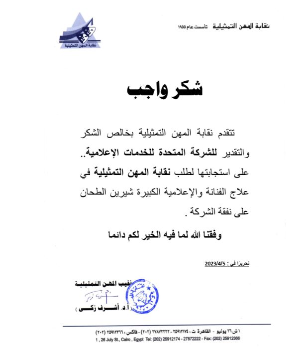 المهن التمثيلية توجه الشكر إلى المتحدة للخدمات الإعلامية بعد استجابتها لعلاج شيرين الطحان
