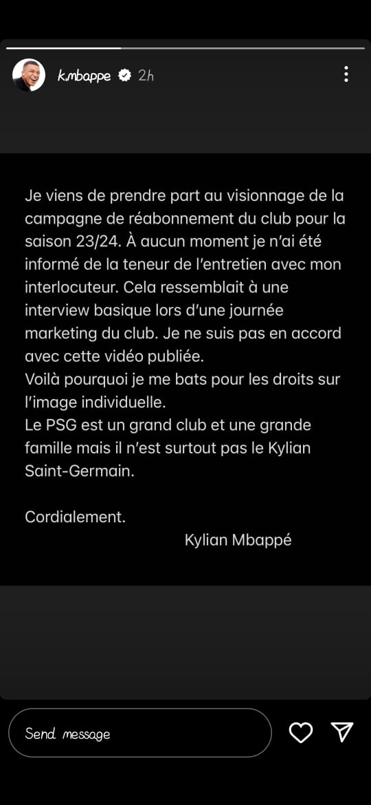 ونشر مبابي بياناً رسمياً عبر صفحته الرسمية بموقع التواصل الإجتماعي انستجرام وكتب: "لقد شاهدت الحملة الإعلانية الترويجية للتذاكر الموسمية للجماهير للموسم المقبل 2024، لكن لم يتم إبلاغي بنشر تلك الحملة الإعلامية، لقد كانت مشاركة عادية ليوم ترويجي في النادي، اعترض تمامًا على الفيديو المنشور".