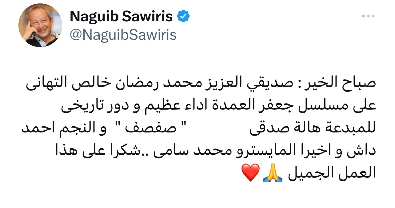 نجيب ساويرس يشيد بمسلسل جعفر العمدة: شكرًا على هذا العمل الجميل
