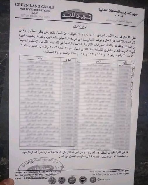 لتسببهم فى خسائر وتوقفهم عن العمل.. فصل 49 عامل بشركة جرين لاند