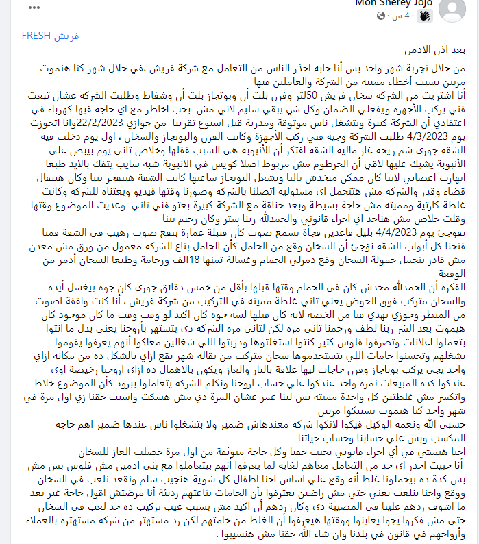 وتابعت عن شكوتها عن شركة فريش،" نفوجئ يوم 4/4/2023 بليل قاعدين فجأة نسمع صوت كأن قنبلة عمارة بتقع صوت رهيب في الشقة قمنا فتحنا كل أبواب الشقة نؤجئ أن السخان وقع من الحامل كأن الحامل بتاع الشركة معمول من ورق مش معدن مش قادر يتحمل حمولة السخان وقع دمرلي الحمام وغسالة ثمنها 18الف ورخامة وطبعا السخان أدمر من الوقعة الفكرة أن الحمدلله محدش كان في الحمام وقتها قبلها بأقل من خمس دقائق جوزي كان جوه بيغسل أيده والسخان متركب فوق الحوض يعني تاني غلطة مميته في التركيب من شركة فريش ، أنا كنت واقفة اصوت من المنظر وجوزي يهدي فيا من الخضه لانه كان قبلها لسه جوه كان اكيد لو وقت وقت ما كان موجود كان هيموت بعد الشر ربنا لطف ورحمنا تاني مرة لكن لتاني مرة الشركة دي بتستهر بأروحنا يعني بدل ما انتوا بتعملوا اعلانات وتصرفوا فلوس كتير كنتوا استغلتوها ودربتوا اللي شغالين معاكوا أنهم يعرفوا يقوموا بشغلهم وتحسنوا خامات اللي بتستخدموها سخان متركب من بقاله شهر يقع ازاي بالشكل ده من مكانه ازاي واحد يجي يركب بوتاجاز وفرن حاجات ليها علاقة بالنار والغاز ويكون بالاهمال ده ازاي اروحنا رخيصة اوي عندكوا كدة المبيعات نمرة واحد عندكوا علي حساب اروحنا ونكلم الشركة يتعاملوا ببرود كأن الموضوع خلاط واتكسر مش غلطتين كل واحدة مميته بس لينا عمر عشان المرة دي مش هسكت واسيب حقنا زي اول مرة في شهر واحد كنا هنموت بسببكوا مرتين حسبي الله ونعمه الوكيل فيكوا لانكوا شركة معندهاش ضمير ولا بتشغلوا ناس عندها ضمير اهم حاجة المكسب وبس علي حسابنا وحساب حياتنا".