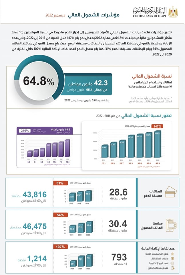 وتشير المؤشرات إلى إحراز تقدم ملحوظ في معدلات الشمول المالي خلال الفترة من 2016-2022، حيث حققت معدل نمو بلغ 147%، ليصل إجمالي المواطنين الذين لديهم حسابات (في البنوك أو البريد المصري، أو محافظ الهاتف المحمول أو البطاقات مسبقة الدفع) إلى 42.3 مليون مواطن بما يعادل 64.8% من إجمالي المواطنين (في الفئة العمرية 16 سنة فأكثر) والبالغ عددهم 65.4 مليون مواطن.