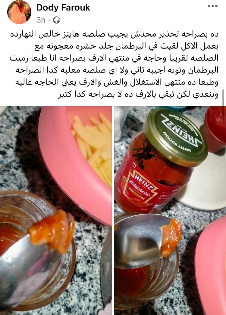 وقالت السيدة فى شكوتها عن صلصة هاينز،" ده بصراحه تحذير محدش يجيب صلصه هاينز خالص النهارده بعمل الاكل لقيت في البرطمان جلد حشره معجونه مع الصلصه تقريبا وحاجه في منتهي الارف بصراحه انا طبعا رميت البرطمان وتوبه اجيبه تاني ولا اي صلصه معلبه كدا الصراحه وطبعا ده منتهي الاستغلال والغش والارف يعني الحاجه غاليه وبنعدي لكن تبقي بالارف ده لا بصراحه كدا كتير".