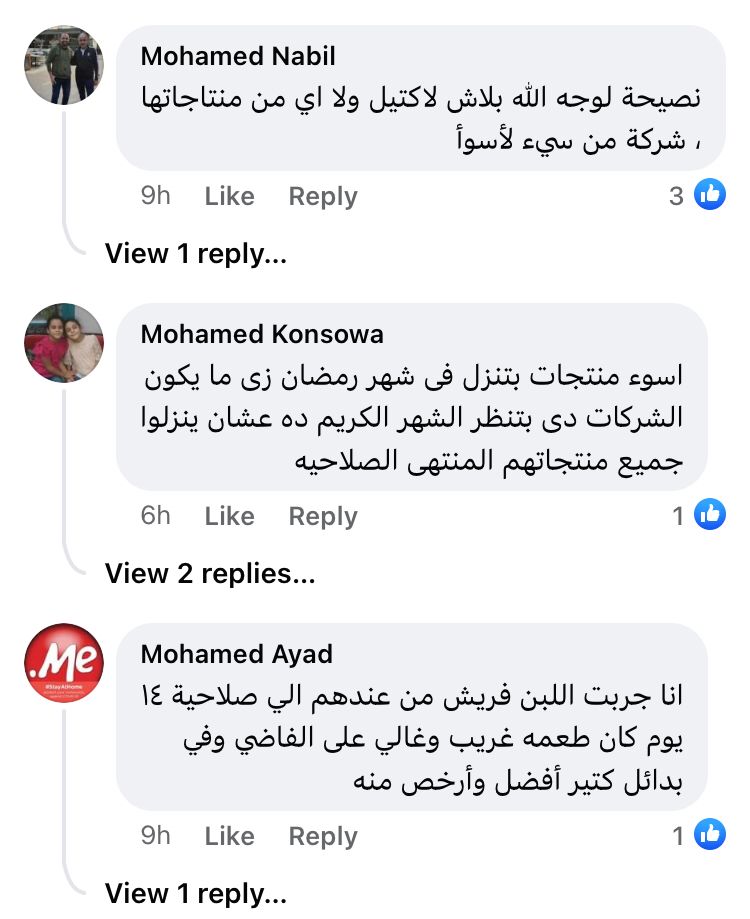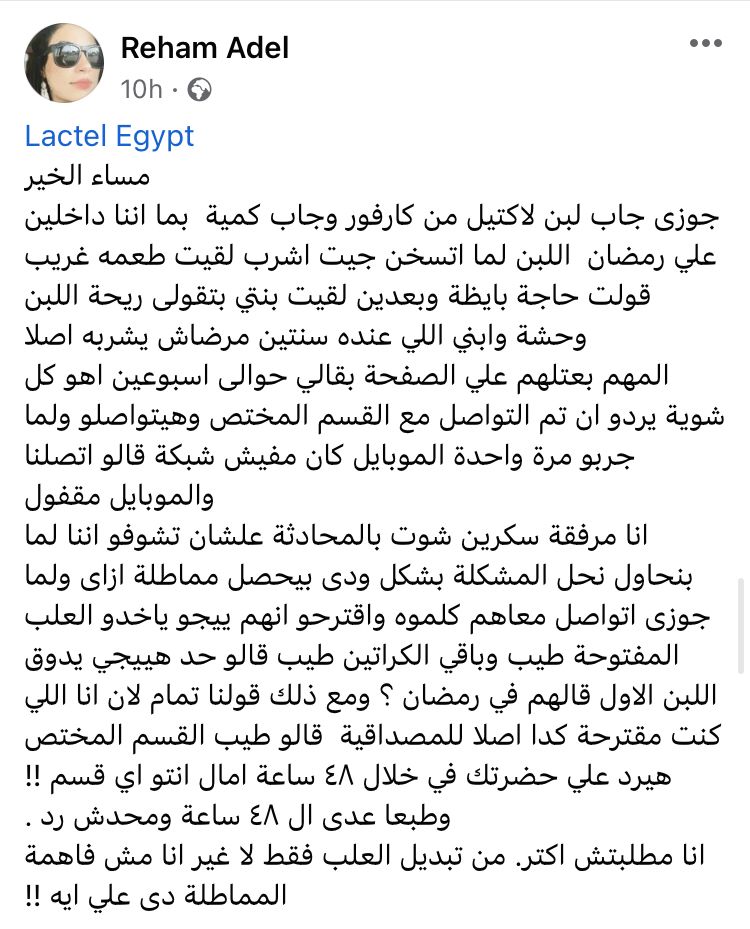 وقالت السيدة،" Lactel Egypt مساء الخير جوزى جاب لبن لاكتيل من كارفور وجاب كمية بما اننا داخلين علي رمضان اللبن لما اتسخن جيت اشرب لقيت طعمه غريب قولت حاجة بايظة وبعدين لقيت بنتي بتقولى ريحة اللبن وحشة وابني اللي عنده سنتين مرضاش يشربه اصلا المهم بعتلهم علي الصفحة بقالي حوالى اسبوعين اهو كل شوية يردو ان تم التواصل مع القسم المختص وهيتواصلو ولما جربو مرة واحدة الموبايل كان مفيش شبكة قالو اتصلنا والموبايل مقفول انا مرفقة سكرين شوت بالمحادثة علشان تشوفو اننا لما بنحاول نحل المشكلة بشكل ودى بيحصل مماطلة ازاى ولما جوزى اتواصل معاهم كلموه واقترحو انهم ييجو ياخدو العلب المفتوحة طيب وباقي الكراتين طيب قالو حد هييجي يدوق اللبن الاول قالهم في رمضان ؟ ومع ذلك قولنا تمام لان انا اللي كنت مقترحة كدا اصلا للمصداقية قالو طيب القسم المختص هيرد علي حضرتك في خلال 48 ساعة امال انتو اي قسم !! وطبعا عدى ال 48 ساعة ومحدش رد ..انا مطلبتش اكتر. من تبديل العلب فقط لا غير انا مش فاهمة المماطلة دى علي ايه.