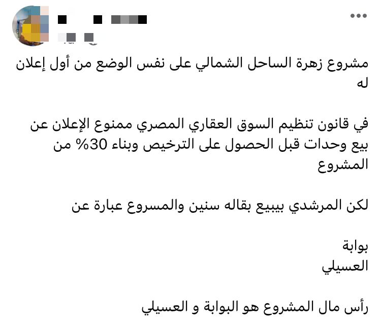 وقال أحد المواطنين فى تعليقه ،" مشروع زهرة الساحل الشمالي على نفس الوضع من أول إعلان له في قانون تنظيم السوق العقاري المصري ممنوع الإعلان عن بيع وحدات قبل الحصول على الترخيص وبناء 30% من المشروع.. لكن المرشدي بيبيع بقاله سنين والمشروع عبارة عن بوابة والعسيلي رأس مال المشروع هو البوابة و العسيلي".