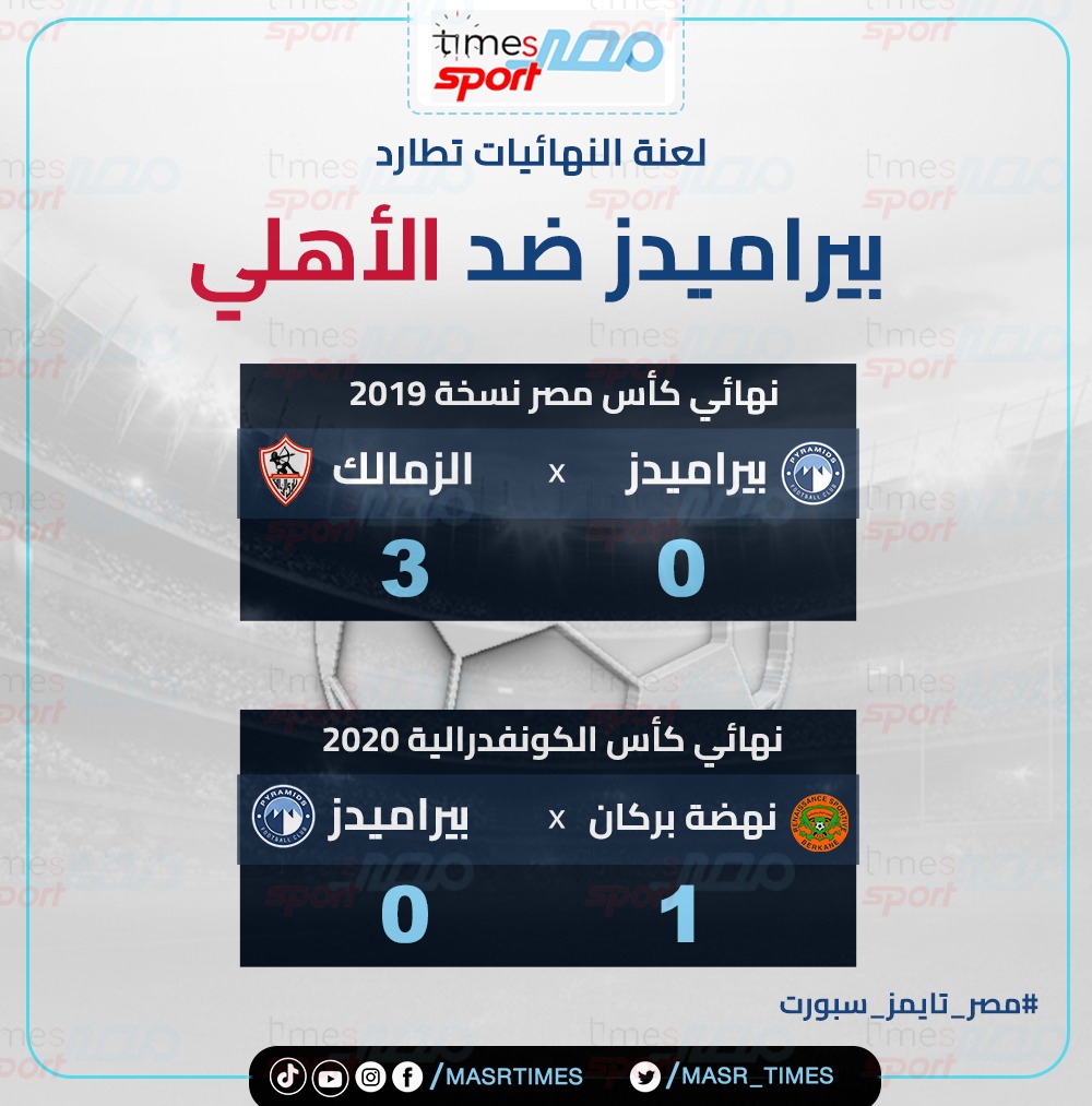يسعي الفريق الأول لكرة القدم بنادي بيراميدز، لكسر لعنة النهائيات التي يعاني، في المباراة التي تجمعه مع النادي الأهلي، غداً الأثنين بـ "ستاد القاهرة"، في نهائي كأس مصر.