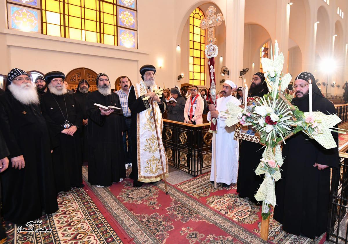 واستقبل خورس الشمامسة البابا تواضروس الثاني بالسعف والصلبان وهم يرتلون لحن الشعانين "افلوجيمينوس"، وصلى قداسته دورة الشعانين، التي تتضمن 12 فصلًا من الإنجيل.