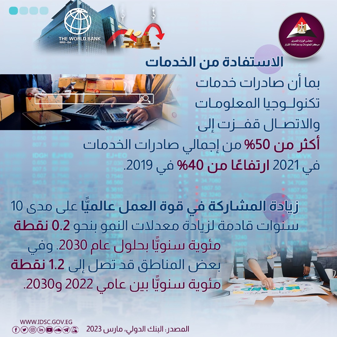 نشر مركز المعلومات ودعم اتخاذ القرار بمجلس الوزراء المصري إنفوجرافيك جديدًا يرصد خلاله ما توصل إليه البنك الدولي فيما يتعلق بحالة الاقتصاد العالمي ومقترحات مواجهة الأزمة العالمية؛ إذ سينخفض متوسط النمو العالمي لإجمالي الناتج المحلي بين عامي 2022 و2030 ليصل إلى 2.2% سنويًّا، وفي حالة الاقتصادات النامية، سيكون الانخفاض حادًّا بالقدر نفسه من 6% سنويًّا بين عامي 2000 و2010 إلى 4% سنويًّا خلال الفترة المتبقية من هذا العقد. ولتقليل حدة هذا المصير، يضع البنك الدولي عددًا من المقترحات تتمثل في: