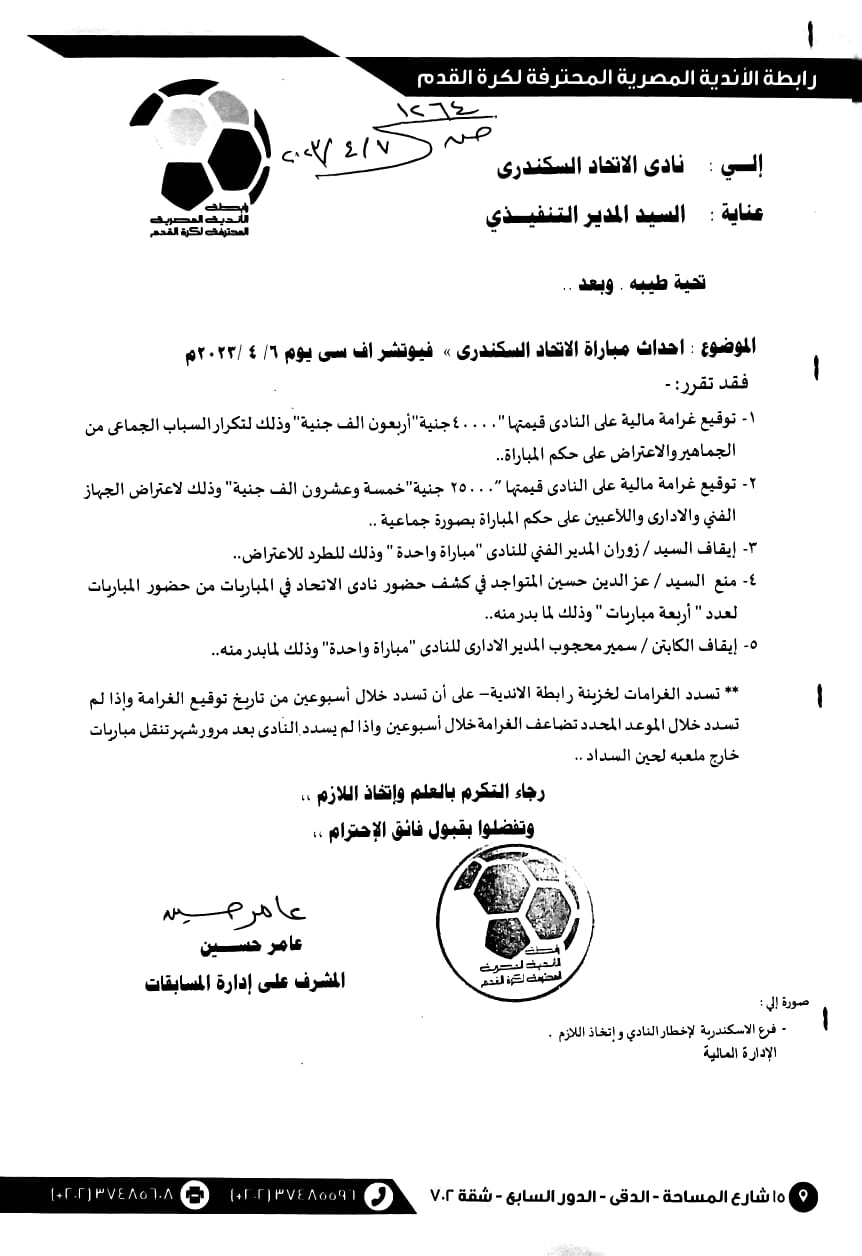 رابطة الأندية.. وقررت لجنة المسابقات توقيع غرامة مالية على الاتحاد السكندرى قيمتها أربعون ألف جنيه وذلك لتكرار السباب الجماعي من الجماهير والاعتراض على حكم اللقاء، بالإضافة إلى 25 ألف جنيه غرامة مالية على النادي وذلك لاعتراض الجهاز الفني والإداري واللاعبين على حكم اللقاء بصورة جماعية.