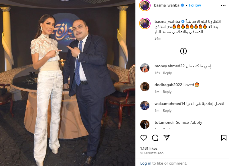 وكتبت بسمة وهبة عبر صفحتها على موقع تبادل الصور والفيديوهات “إنستجرام” قائلة :" انتظرونا ليله غداً وحلقه مع استاذي الصحفي والاعلامي محمد الباز".