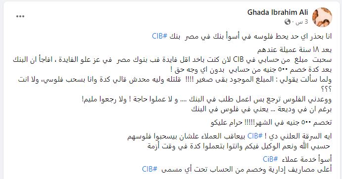 وقالت صاحبة الشكوي مع بنك cib، " انا بحذر اي حد يحط فلوسه في أسوأ بنك في مصر بنك CIB بعد 18 سنة عميلة عندهم سحبت مبلغ من حسابي في CIB لان كنت باخد اقل فايدة في بنوك مصر في عز علو الفايدة ، افاجأ ان البنك بعد كدة خصم 500 جنيه من حسابي بدون اي وجه حق !ولما سألت يقولي : المبلغ الموجود بقى صغير !!!! قلتله وليه محدش قالي كدة وانا بسحب فلوسي، ولا انت ؟؟؟ ووعدني الفلوس ترجع بس اعمل طلب في البنك .... و لا عملوا حاجة ! ولا رجعوا مليم!".