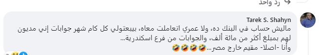 وقال صاحب المشكلة الطريفة مع البنك ،" ماليش حساب في البنك ده، ولا عمري اتعاملت معاه، بيبعتولي كل كام شهر جوابات إني مديون لهم بمبلغ أكثر من مائة ألف، والجوابات من فرع اسكندرية...وأنا -اصلا- مقيم خارج مصر.".