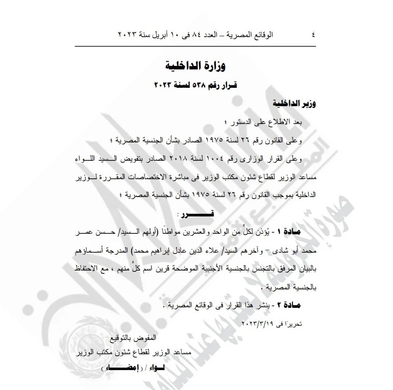 نشرت الجريدة الرسمية، اليوم الإثنين، قرار وزير الداخلية بالسماح لـ 21 مواطنًا ، بالتجنس بالجنسية الأجنبية .