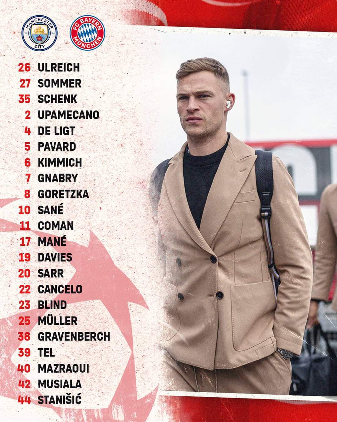 أعلن توماس توخيل ، المدير الفني لفريق بايرن ميونخ الألماني عن قائمة فريقه الرسمية لمواجهة مانشستر سيتي الإنجليزي غداً الثلاثاء في الساعة التاسعة مساءً، ضمن منافسات ربع نهائي دوري أبطال أوروبا.