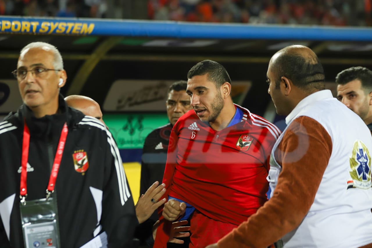 بعد اصابته بالكتف.. رامى ربيعة يغادر ارضية الملعب بمساعدة الفريق الطبى