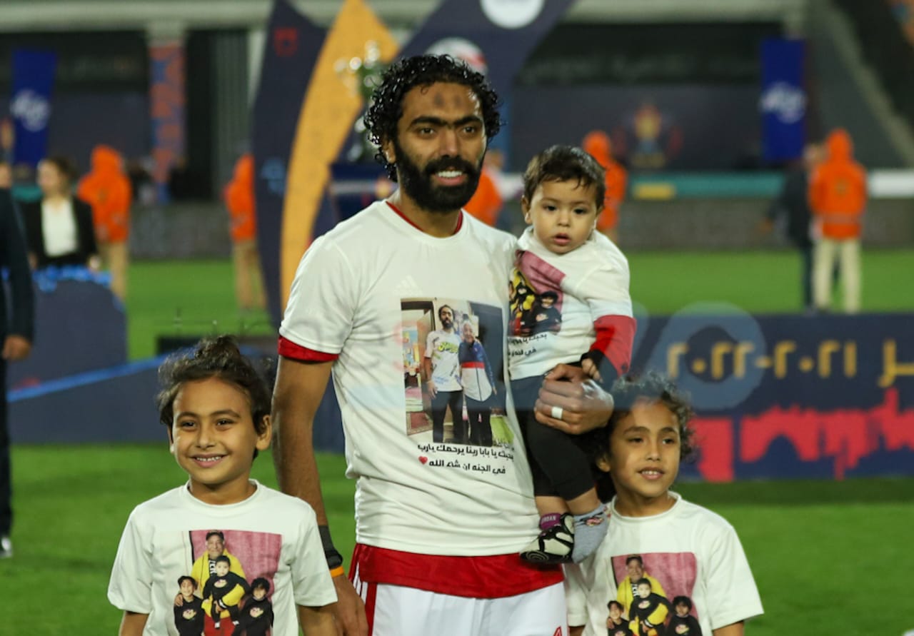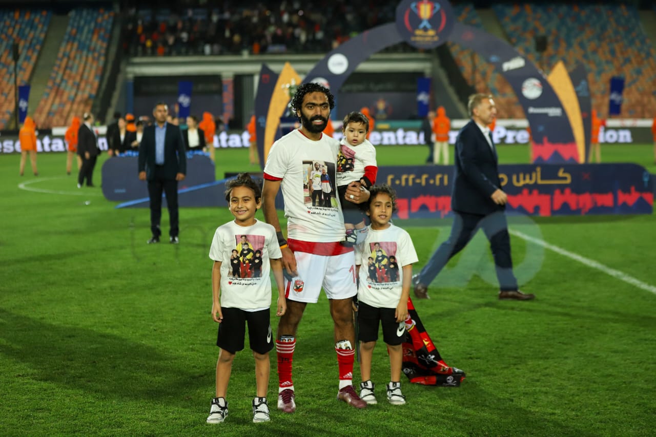 أحتفل حسين الشحات لاعب الفريق الأول لكرة القدم بالنادي الأهلي، بتتويج المارد الأحمر بكأس مصر، رفقه أطفاله وزميله محمود كهربا، إلى جانب حاملي الكرات.