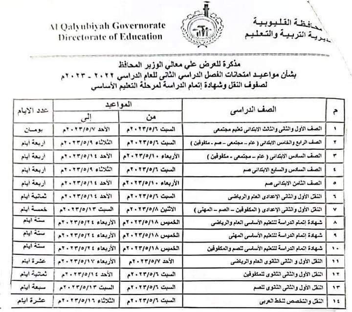 الخريطة الزمنية لمواعيد امتحانات صفوف النقل والإعدادية بالقليوبية