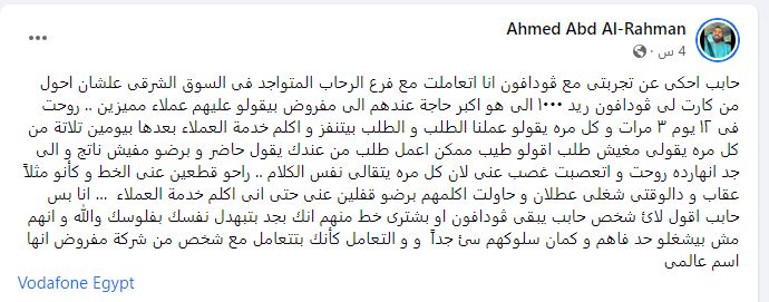 وقال صاحب المشكلة مع فودافون،" حابب احكى عن تجربتى مع ڤودافون انا اتعاملت مع فرع الرحاب المتواجد فى السوق الشرقى علشان احول من كارت لى ڤودافون ريد 1000 الى هو اكبر حاجة عندهم الى مفروض بيقولو عليهم عملاء مميزين .. روحت فى 12 يوم 3 مرات و كل مره يقولو عملنا الطلب و الطلب بيتنفز و اكلم خدمة العملاء بعدها بيومين تلاتة من كل مره يقولى مغيش طلب اقولو طيب ممكن اعمل طلب من عندك يقول حاضر و برضو مفيش ناتج و الى جد انهارده روحت و اتعصبت غصب عنى لان كل مره يتقالى نفس الكلام .. راحو قطعين عنى الخط و كأنو مثلاً عقاب و دالوقتى شغلى عطلان و حاولت اكلمهم برضو قفلين عنى حتى انى اكلم خدمة العملاء".