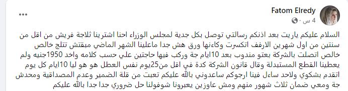 وتابعت عن شركة فريش،" كل يوم اتقدم بشكوي ولاحد ساءل فينا ارجوكم ساعدوني بالله عليكم تعبت من قلة الضمير وعدم المصداقية ومحدش جة ومعي ضمان ثلاث شهور منهم ومش عاوزين يعبرونا شوفولنا حل ضروري جدا جدا بالله عليكم ".