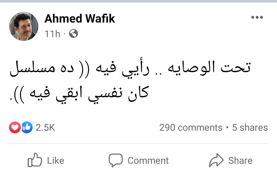 وكتب أحمد وفيق عبر صفحته على موقع التواصل الإجتماعي “ الفيسبوك” قائلا:" تحت الوصايه .. رأيي فيه (ده مسلسل كان نفسي ابقي فيه)".