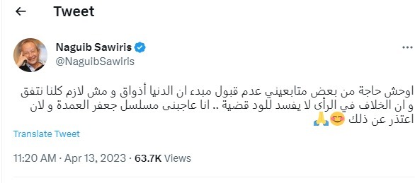 كتب نجيب ساويرس عبر صفحته على موقع التدوينات القصيرة “تويتر” مغردا:"أوحش حاجة من بعض متابعيني عدم قبول مبدأ إن الدنيا أذواق ومش لازم كلنا نتفق، وأن الخلاف في الرأى لا يفسد للود قضية.. أنا عاجبنى مسلسل جعفر العمدة ولن أعتذر عن ذلك".