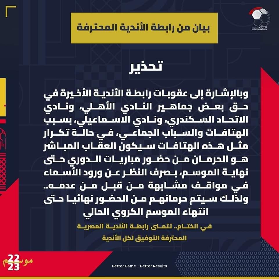 "وبالإشارة إلى عقوبات رابطة الأندية الأخيرة في حق بعض جماهير النادي الأهلي ونادي الاتحاد السكندري والنادي الإسماعيلي بسبب الهتافات والسباب الجماعي، في حالة تكرار مثل هذه الهتافات سيكون العقاب المباشر هو الحرمان من حضور مباريات الدوري حتى نهاية الموسم، بصرف النظر عن ورود الأسماء في مواقف مشابهة من قبل من عدمه، ولذلك سيتم حرمانهم من الحضور نهائيا حتى انتهاء الموسم الكروي الحالي".