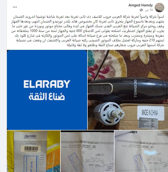 وتابعت عن مشكلتها مع شركة العربي،" اضطريت اصلحه يقولى ثمن الاصلاح 600 جنيه والجهاز ثمنه من سنة 1000 بملحقاته من مفرمة ومبشرة ومضرب وبعد ما صلحته فى فرع صيانة اسالة على ثمن الموتور والكارته فى شارع كلود بك ثمنهم 210 جنيه وماركة افضل بخلاف الموتور الصينى ركبه صيانة العربى واكتشفت ان وقعت فى نصباية شركة اسمها العربى جروب شعارهم صناع الثقة وطلعو ولا ثقة ولانيلة".