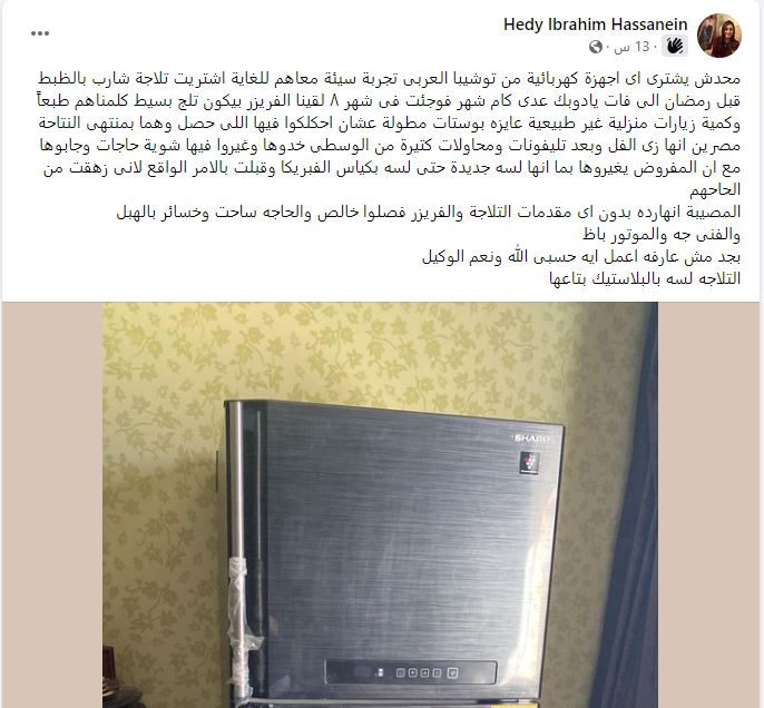 وتابعت عن مشكلتها مع شركة العربي ،" المصيبة انهارده بدون اى مقدمات التلاجة والفريزر فصلوا خالص والحاجه ساحت وخسائر بالهبل والفنى جه والموتور باظ بجد مش عارفه اعمل ايه حسبى الله ونعم الوكيل التلاجه لسه بالبلاستيك بتاعها".