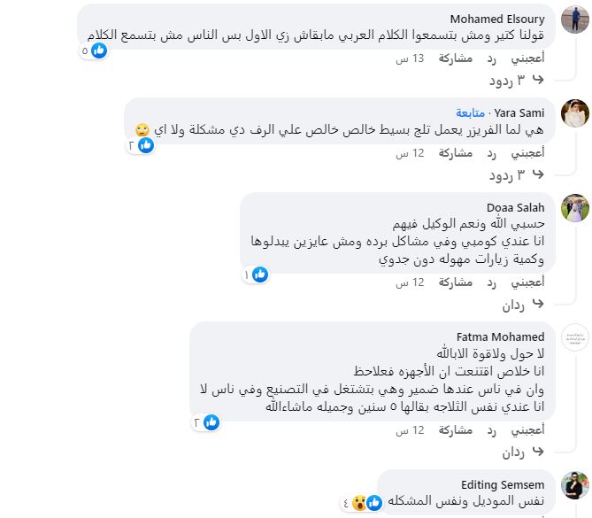 وقالت سيدة أخري عن مشكلتها مع شركة العربي،" محدش يشترى اى اجهزة كهربائية من توشيبا العربى تجربة سيئة معاهم للغاية اشتريت تلاجة شارب بالظبط قبل رمضان الى فات يادوبك عدى كام شهر فوجئت فى شهر 8 لقينا الفريزر بيكون تلج بسيط كلمناهم طبعاً وكمية زيارات منزلية غير طبيعية عايزه بوستات مطولة عشان احكلكوا فيها اللى حصل وهما بمنتهى النتاحة مصرين انها زى الفل وبعد تليفونات ومحاولات كتيرة من الوسطى خدوها وغيروا فيها شوية حاجات وجابوها مع ان المفروض يغيروها بما انها لسه جديدة حتى لسه بكياس الفبريكا وقبلت بالامر الواقع لانى زهقت من الحاحهم".