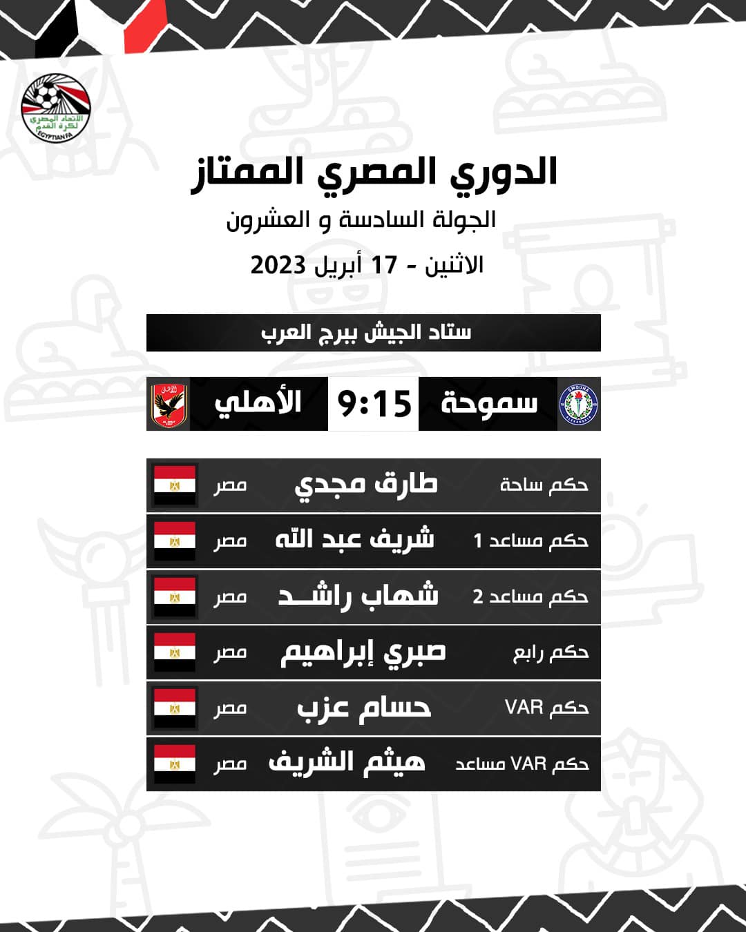 ويدير طارق مجدي مباراة سموحة والأهلي التي تقام في استاد برج العرب بالإسكندرية، ويعاونه كل من شريف عبد الله وشهاب راشد، وصبري إبراهيم حكما رابعا، و حسام عزب وهيثم الشريف للفيديو.