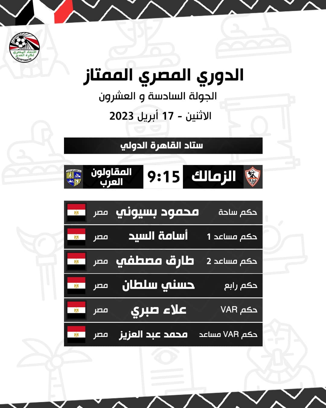 يدير محمود بسيوني مباراة الزمالك والمقاولون العرب التي تقام في استاد القاهرة الدولي، ويعاونه كل من أسامة السيد وطارق مصطفي، وحسني سلطان حكما رابعا، وعلاء صبري ومحمد عبدالعزيز للفيديو.