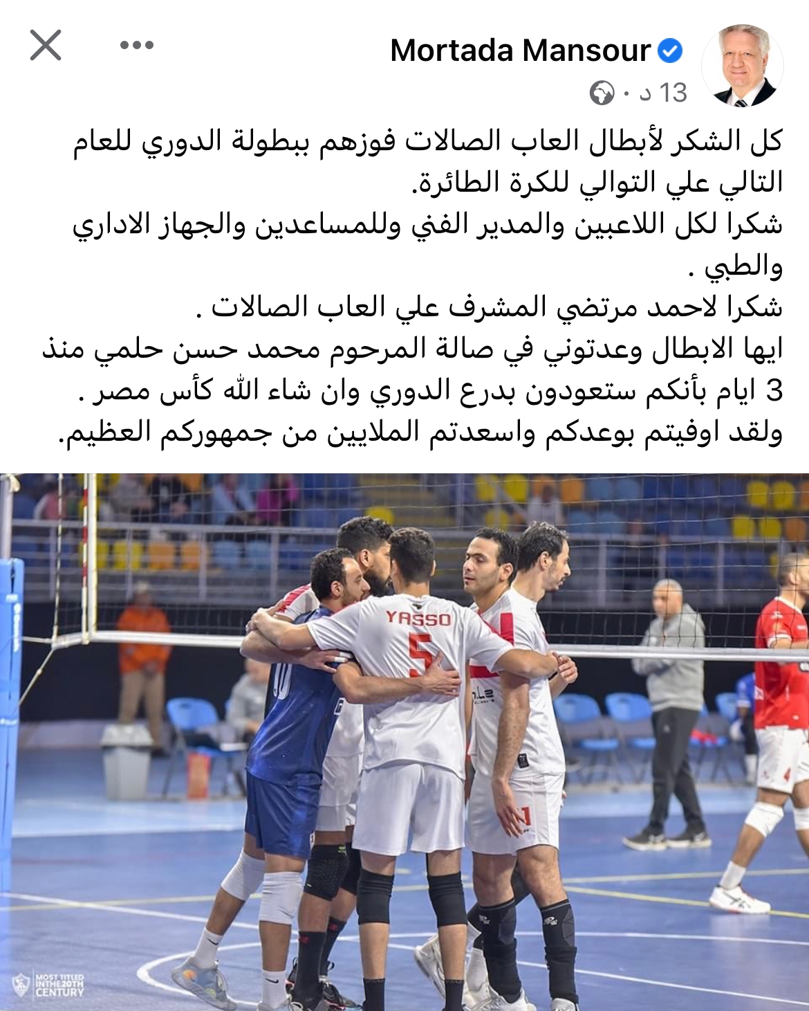 تقدم المستشار مرتضى منصور رئيس مجلس إدارة نادي الزمالك بالتهنئة للفريق الأول للكرة الطائرة بالنادي، بعد الفوز ببطولة الدوري للمرة الثامنة والعشرين في تاريخه على حساب فريق الأهلي.