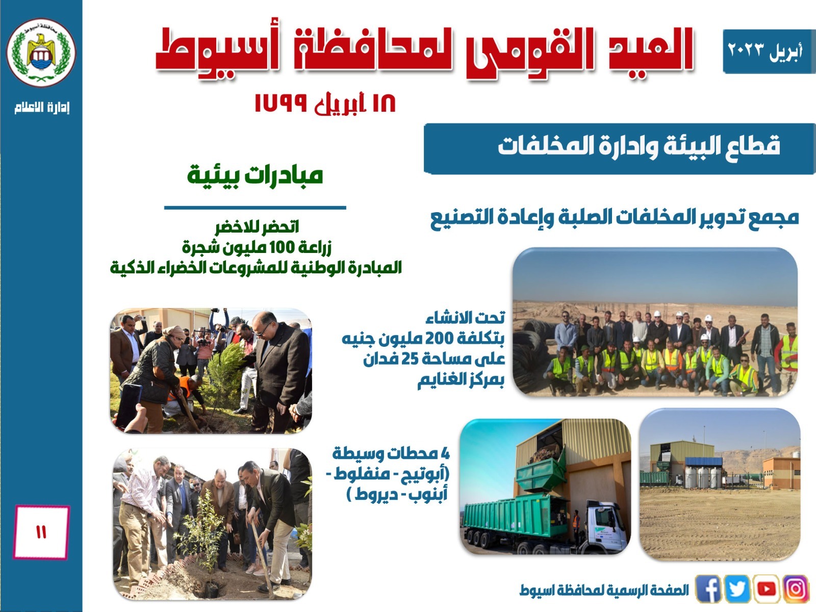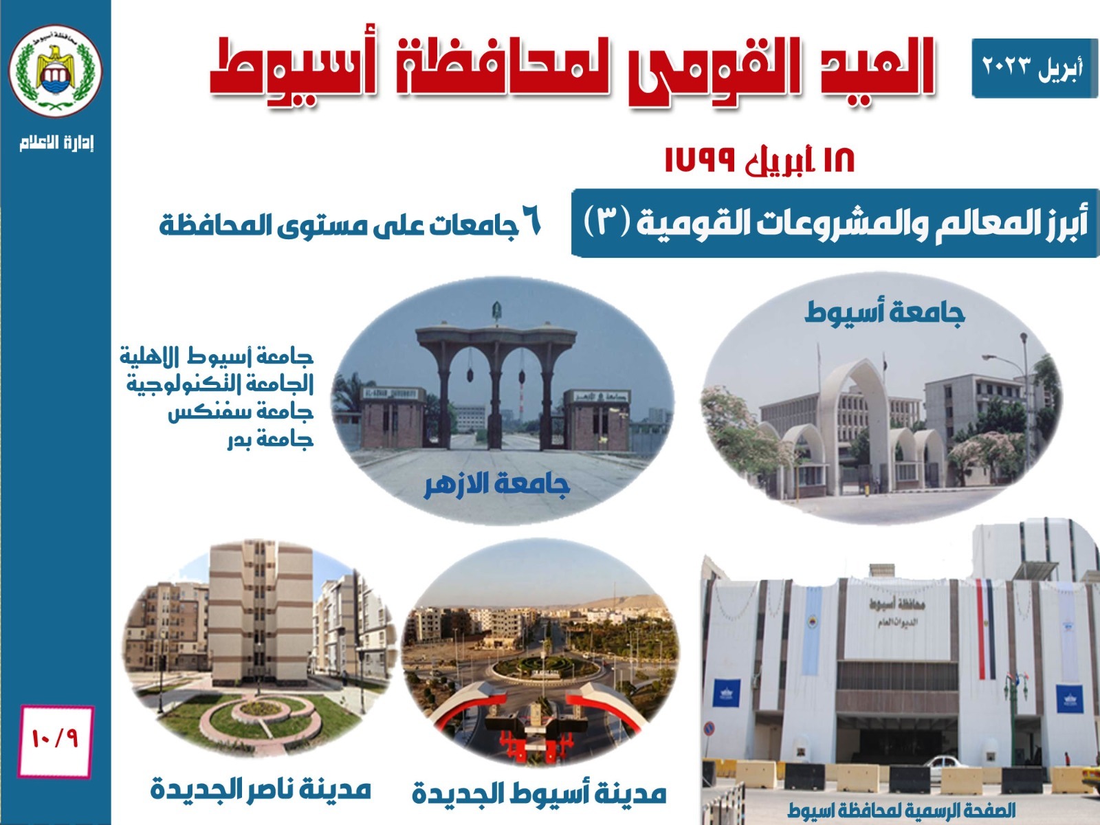 وأوضح محمود فوزي مدير إدارة الإعلام والمتحدث الاعلامي للمحافظة إنه تزامنًا مع الاحتفال بالعيد القومي للمحافظة تم إصدار انفوجراف مصور يتضمن 12 شريحة تبرز أهم المشروعات التنموية والقومية والمبادرات الرئاسية وأبرز المعلومات عن المحافظة ومعالمها الاثرية والسياحية ومواردها الزراعية والصناعية منها المبادرة الرئاسية حياة كريمة والمبادرات البيئية ومشروعات قطاع البيئة وتدوير المخلفات ومشروع قناطر أسيوط الجديدة ومشروع مجمع انتاج البنزين ومحطة كهرباء غرب أسيوط المركبة بالإضافة إلى مطار أسيوط الدولي ومستشفى أبوتيج النموذجي وأبرز المعالم الحضارية والأثرية بالمحافظة وأبرز التكتلات الاقتصادية بالمحافظة منها "النباتات البستانية كالرمان والنباتات العطرية كالريحان والشمر وانتاج عسل النحل" والتي يجرى تعظيم الاستفادة منها بإنشاء مصانع بالمحافظة ضمن برنامج التنمية المحلية بصعيد مصر لافتًا إلى أن قسم التوثيق والمعلومات بإدارة الاعلام يحرص على نشر المعلومات وأصدار الانفوجراف والنشرات والبيانات الاعلامية التي تهم المواطنين وتساعد على جذب وتشجيع الاستثمارات للمحافظة والترويج للمشروعات القومية والتنموية فضلًا عن تنظيم حملات التوعية والتثقيف للقضايا المجتمعية والبيئية والمشاركة المجتمعية وحث الشباب والمواطنين على المشاركة في المبادرات التنموية المختلفة.