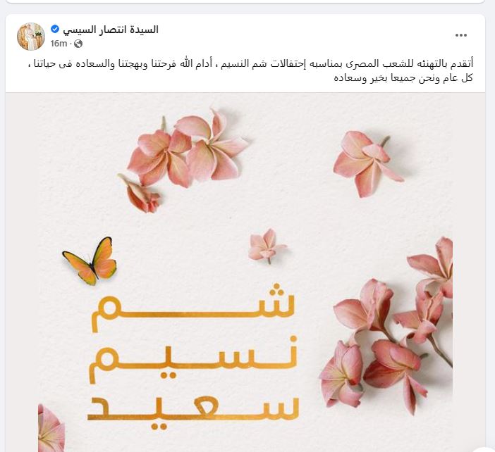 وكتبت السيدة انتصار السيسي، قرينة الرئيس عبد الفتاح السيسي، عبر صفحتها الرسمية على موقع التواصل الاجتماعي فيسبوك: أتقدم بالتهنئة للشعب المصري بمناسبة احتفالات شم النسيم، أدام الله فرحتنا وبهجتنا والسعادة في حياتنا، كل عام ونحن جميعا بخير وسعادة.