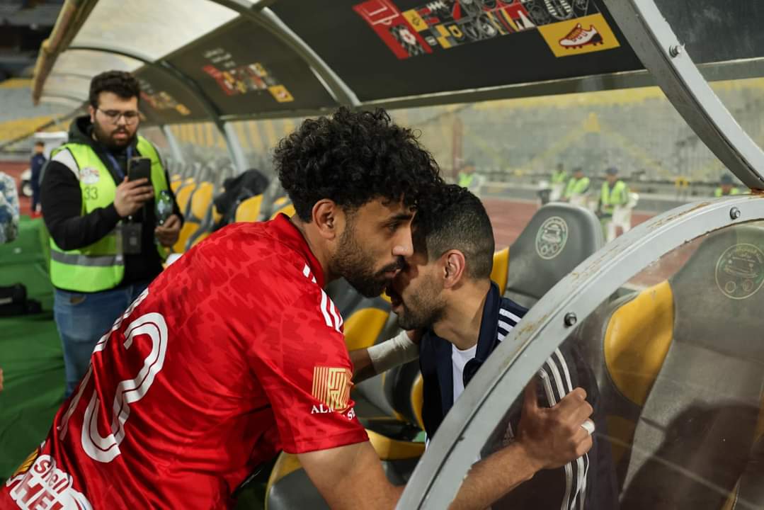 رحب لاعبي الفريق الأول لكرة القدم بالنادي الأهلي بنجم الفريق السابق مؤمن زكريا، خلال مباراة المارد الأحمر ضد سموحة التي تجمع بينهما حالياً ضمن منافسات الدوري المصري.