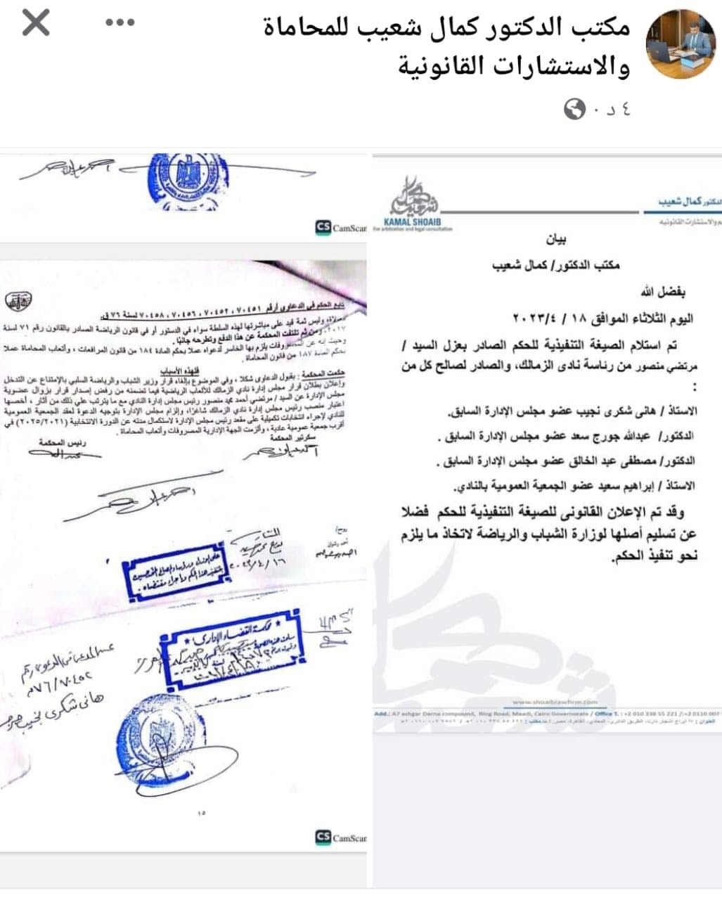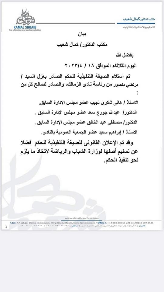 وقضت الدائرة الثانية بمحكمة القضاء الإداري، بإلزام الدكتور أشرف صبحي، وزير الشباب والرياضة، بإصدار قرار بزوال عضوية مرتضى منصور كرئيس لنادي الزمالك، واستبعاده من مجلس الإدارة، وجاء نص البيان كالاتي: مكتب الدكتور كمال شعيب للتحكيم والاستشارات القانونية
