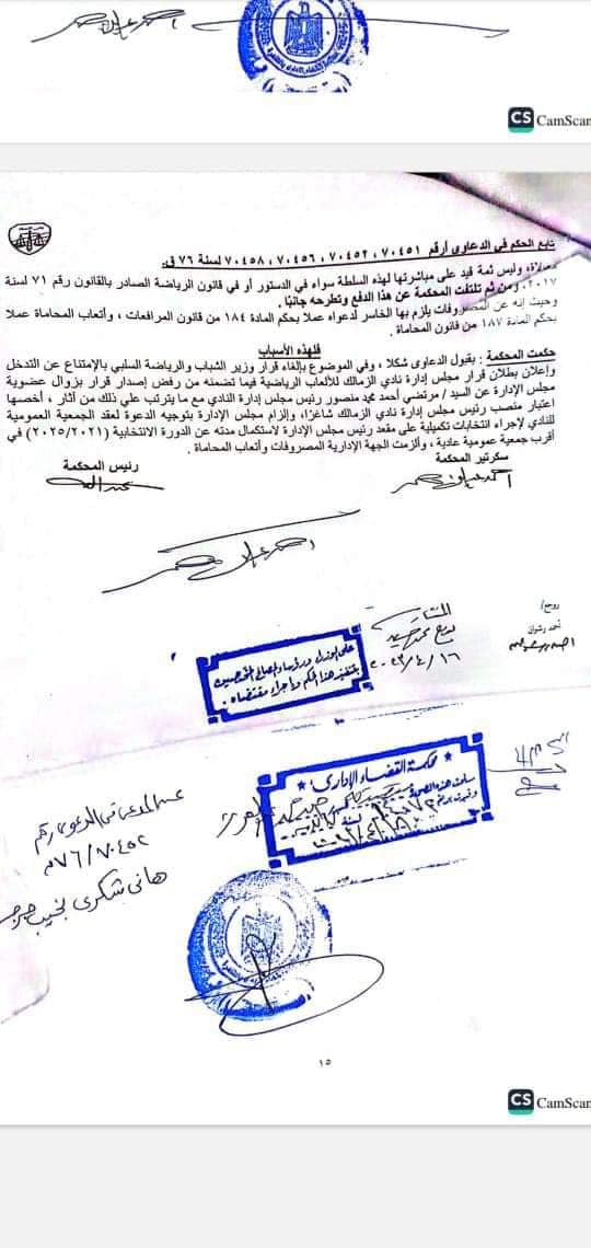 المستشار القانوني لـ ممدوح عباس.. بفضل الله اليوم الأحد الموافق 16-4-2023 قضت محكمة القضاء الإداري في الدعاوى الأربعة أرقام 70451 و70452 و 70454 و70456 لسنة 67 قضائية و المقامين من كل من الاستاذ هانى شكرى نجيب عضو مجلس الإدارة السابق ، والدكتور عبدالله جورج عضو مجلس الإدارة السابق ، والدكتور مصطفى عبد الخالق عضو مجلس الإدارة السابق ، والاستاذ إبراهيم سعيد عضو الجمعية العمومية بالنادي.