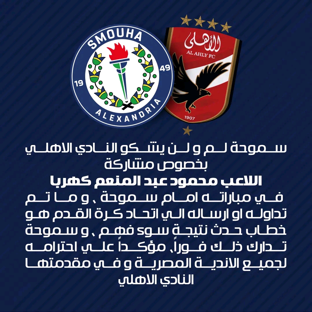 وكتب الحساب الرسمي لنادي سموحة عبر فيسبوك، اليوم الأربعاء: سموحة لم ولن يشكو النادي الأهلي بسبب مشاركة اللاعب محمود كهربا في مباراته أمام سموحة.