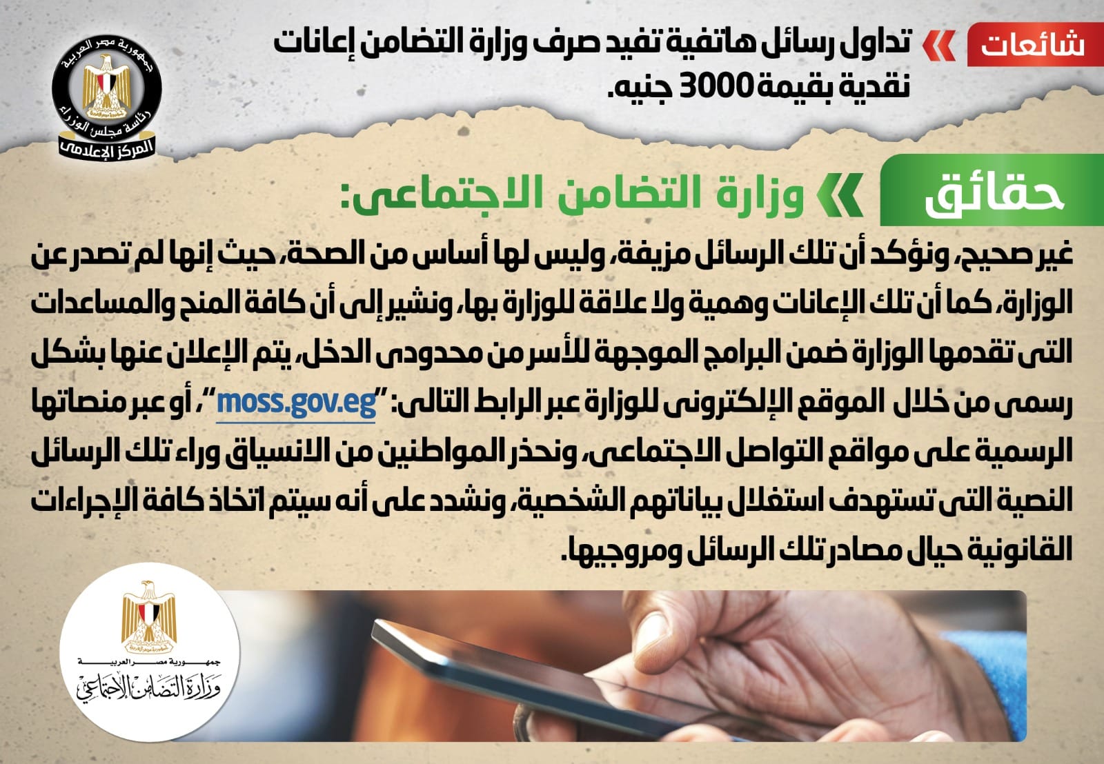 تداولت بعض المواقع الإلكترونية وصفحات التواصل الاجتماعي رسائل هاتفية تفيد صرف وزارة التضامن الاجتماعي إعانات نقدية بقيمة 3000 جنيه.
