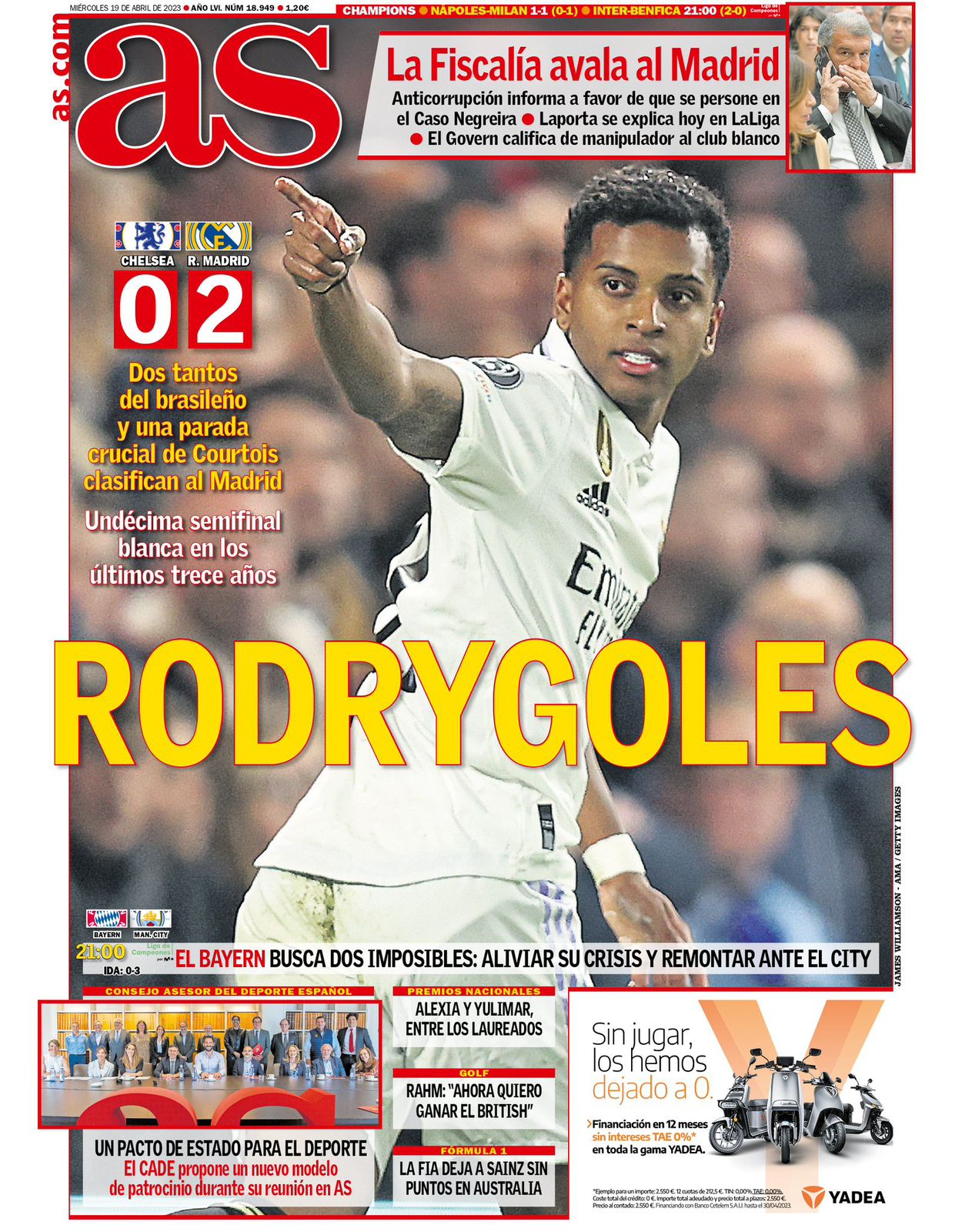 مباراة الريال ..فيما عنونت صحيفة "آس" الإسبانية: "أهداف رودريجو، ثنائية من البرازيلى وتصدى مهم من كورتوا يؤهلان ريال مدريد الى نصف النهائى الـ11 فى آخر 13 عاماً".