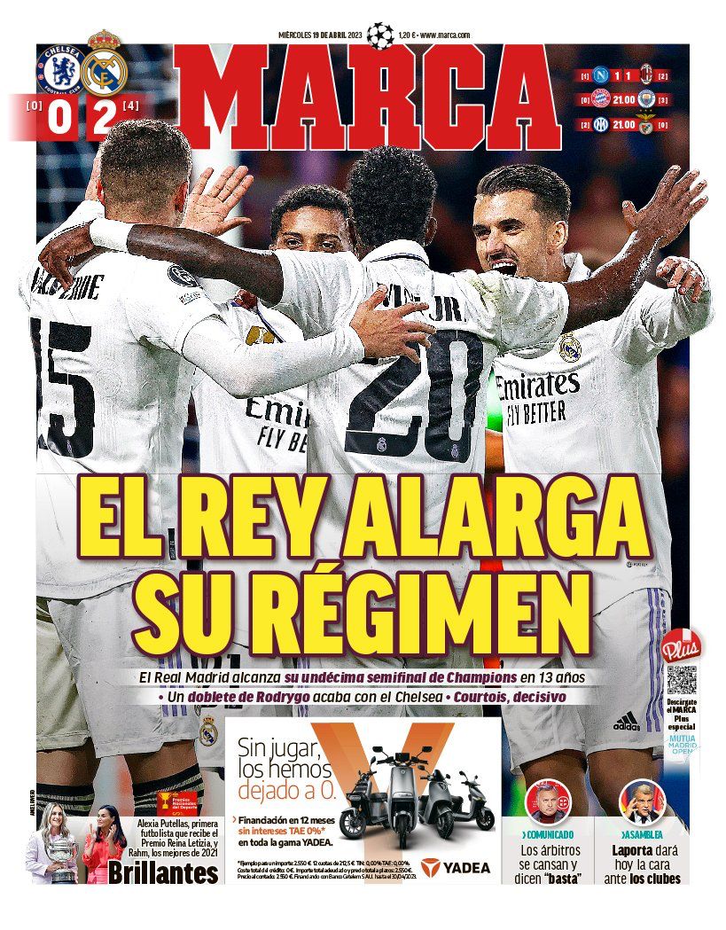 مباراة الريال ..وكتبت صحيفة "ماركا" الإسبانية: "الملك يمدد نظامه.. ريال مدريد إلى نصف النهائى للمرة 11 فى آخر 13 عاماً، رودريجو يقضى على تشيلسى بثنائية وكورتوا كان حاسما".