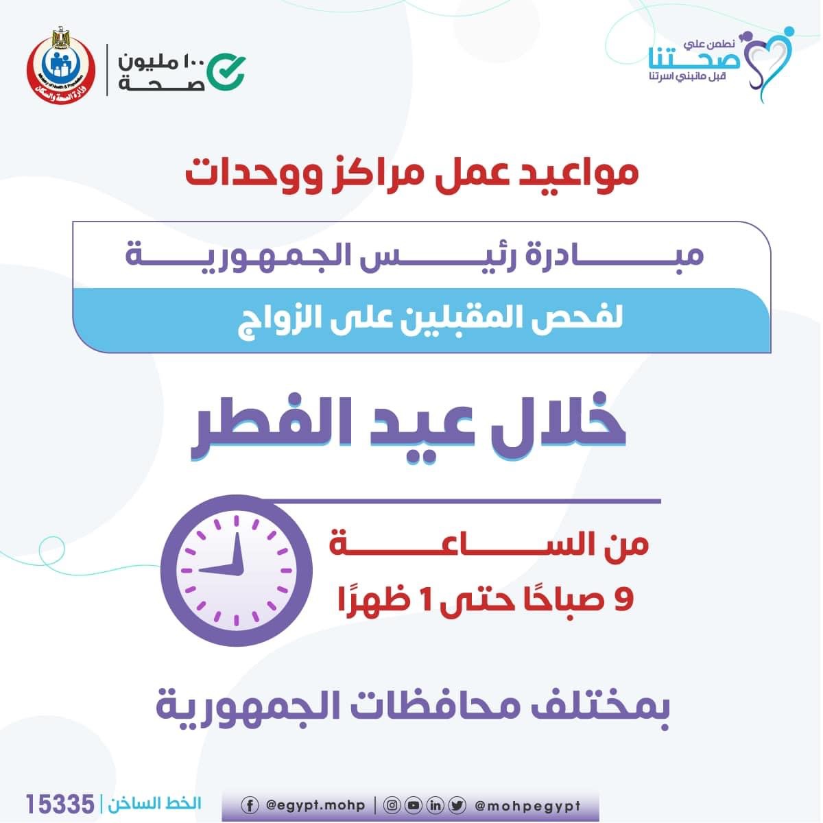 أكدت وزارة الصحة والسكان، استمرار العمل بـ 89 مركزًا رئيسيًا لإجراء فحوصات المقبلين على الزواج، خلال فترة إجازات عيد الفطر المبارك من اليوم وحتى يوم الثلاثاء المقبل، بجميع محافظات الجمهورية، وذلك في إطار التيسير على المواطنين.