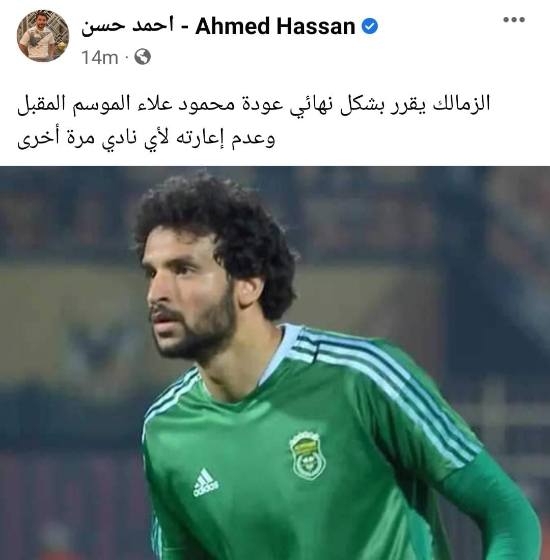 وقال أحمد حسن عبر حسابه الشخصي بموقع التواصل الاجتماعي: "الزمالك يقرر بشكل نهائي عودة محمود علاء الموسم المقبل وعدم إعارته لأي نادي مرة أخرى".