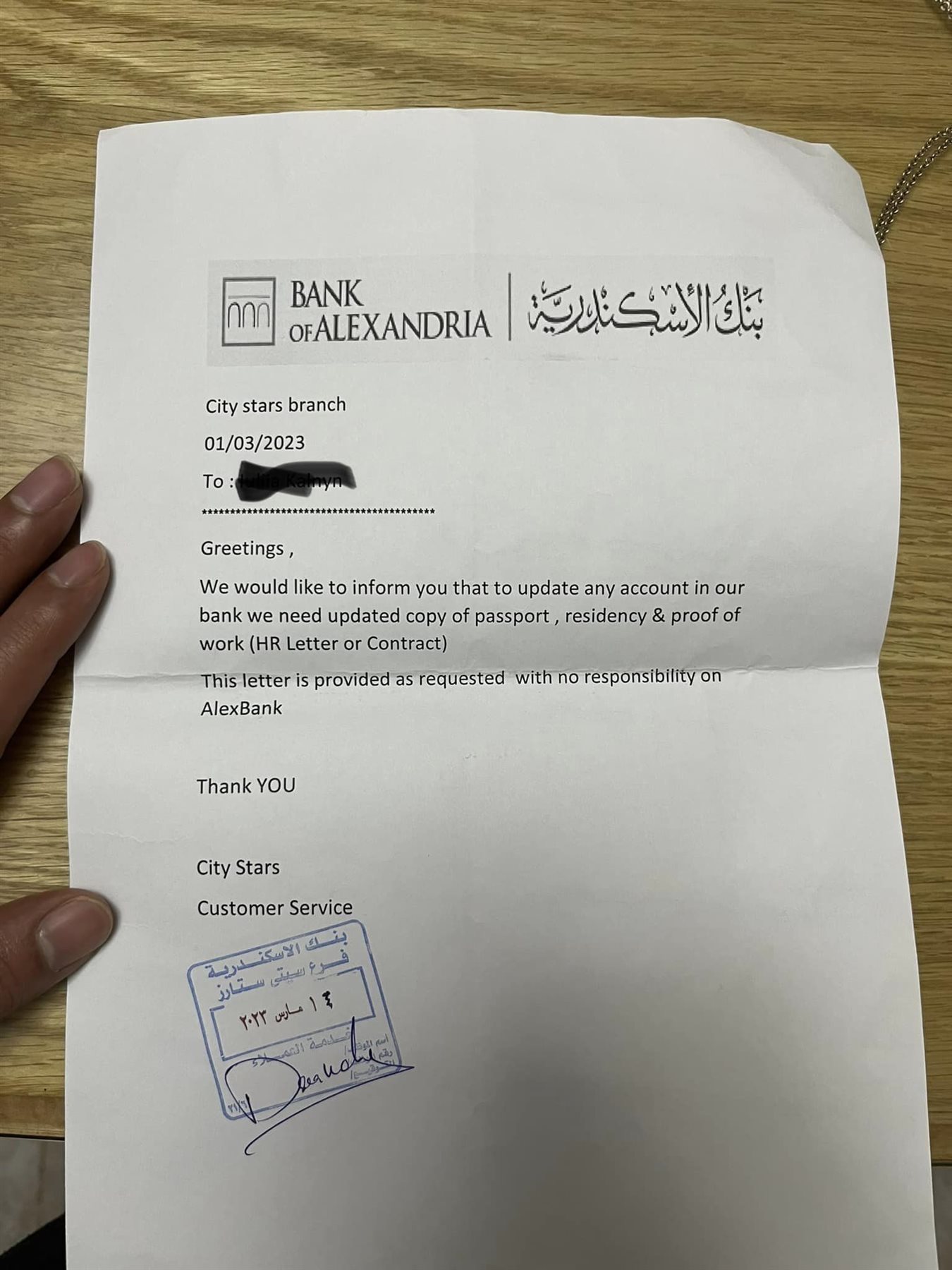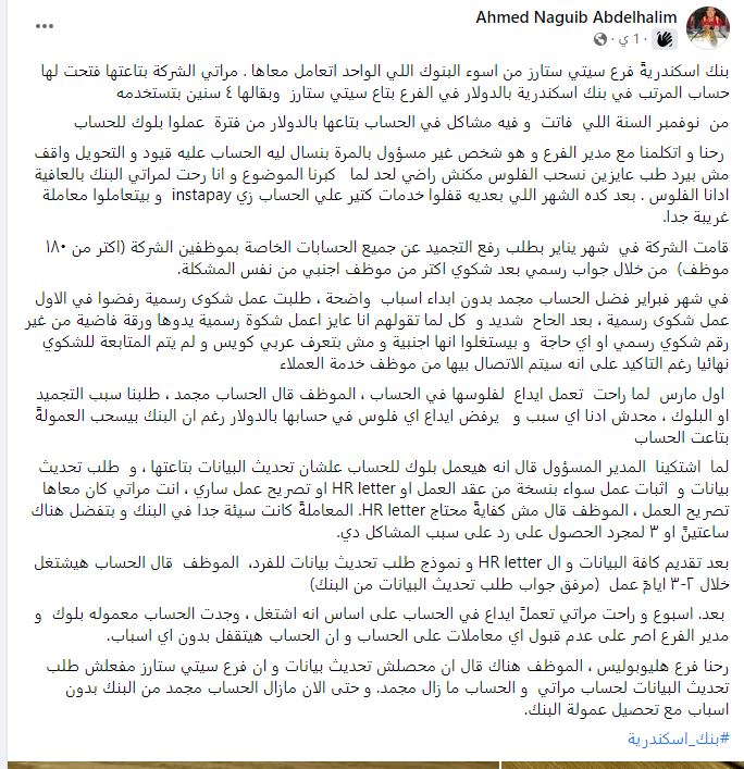 وعن مشكلته مع بنك الإسكندرية ،" في شهر فبراير فضل الحساب مجمد بدون ابداء اسباب واضحة ، طلبت عمل شكوى رسمية رفضوا في الاول عمل شكوى رسمية ، بعد الحاح شديد و كل لما تقولهم انا عايز اعمل شكوة رسمية يدوها ورقة فاضية من غير رقم شكوي رسمي او اي حاجة و بيستغلوا انها اجنبية و مش بتعرف عربي كويس و لم يتم المتابعة للشكوي نهائيا رغم التاكيد على انه سيتم الاتصال بيها من موظف خدمة العملاء اول مارس لما راحت تعمل ايداع لفلوسها في الحساب ، الموظف قال الحساب مجمد ، طلبنا سبب التجميد او البلوك ، محدش ادنا اي سبب و يرفض ايداع اي فلوس في حسابها بالدولار رغم ان البنك بيسحب العمولةً بتاعت الحساب لما اشتكينا المدير المسؤول قال انه هيعمل بلوك للحساب علشان تحديث البيانات بتاعتها ، و طلب تحديث بيانات و اثبات عمل سواء بنسخة من عقد العمل او HR letter او تصريح عمل ساري ، انت مراتي كان معاها تصريح العمل ، الموظف قال مش كفايةً محتاج HR letter. المعاملةً كانت سيئة جدا في البنك و بتفضل هناك ساعتينً او 3 لمجرد الحصول على رد على سبب المشاكل دي".