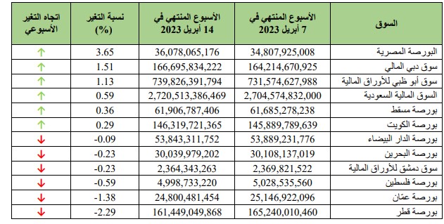 تفوقت البورصة المصرية على نظيراتها من البورصات العربية والخليجية من حيث النشاط والآداء خلال تداولات الاسبوع الماضي، لتتصدر ارتفاعات بورصات النقطة وشمال افريقيا بما نسبته 3.65 %، وبقيمة سوقية جاوزت الـ 36.078 مليون دولار، بنهاية الاسبوع الماضي وذلك فى مقابل 34.807 مليار دولار فى الاسبوع السابق عليه، وذلك وفقا لتقرير صادر اليوم الجمعة عن "صندوق النقد العربي" .