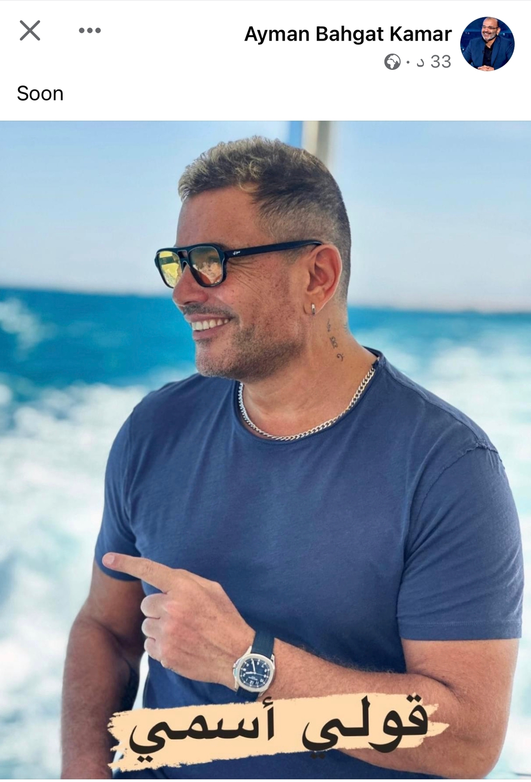 يستعد الهضبة عمرو دياب، اليوم لطرح أغنية جديدة تحمل اسم "قولي اسمي" ، حيث روج لها أيمن بهجت قمر عبر حسابه الرسمي بموقع التواصل الاجتماعي فيسبوك ، قائلاً: "قريباً".